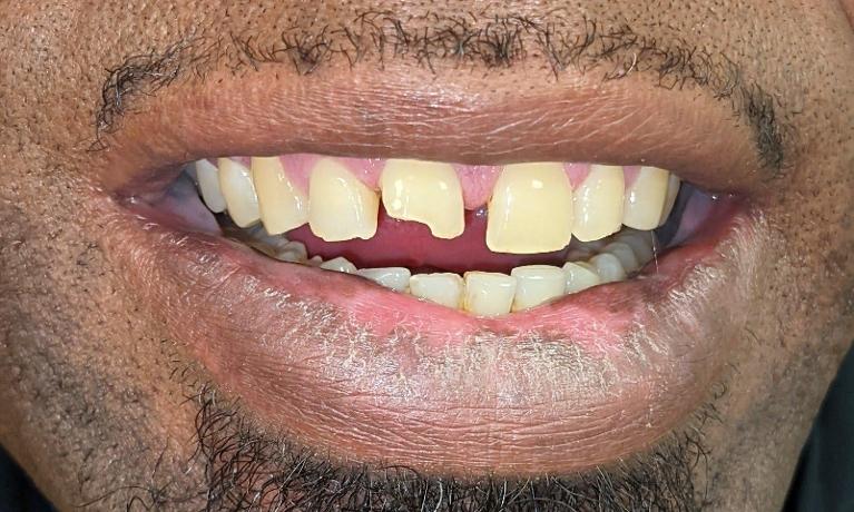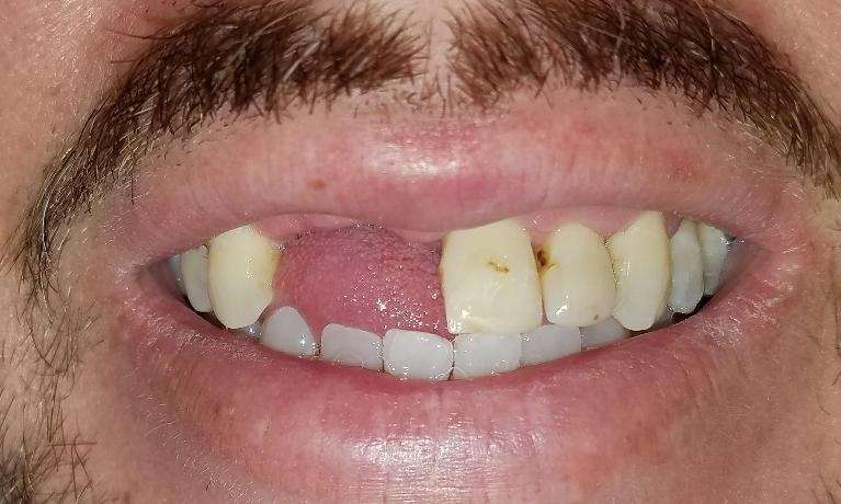 This patient didn't like his front teeth for obvious reasons. We were able to remove the bad teeth and replace them with a partial printed out in one day. In six months we will come back and make him a new set of teeth that look even better.